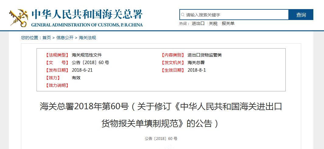政策|海关总署2018年第60号(关于修订《中华人民共和国海关进出口货物报关单填制规范》的公告)