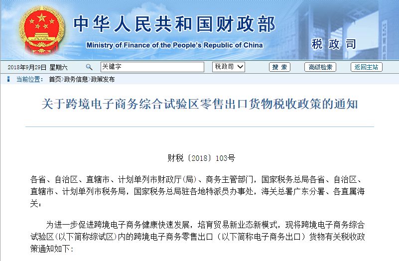 重要|财政部发布关于跨境电子商务综合试验区零售出口货物税收政策的通知
