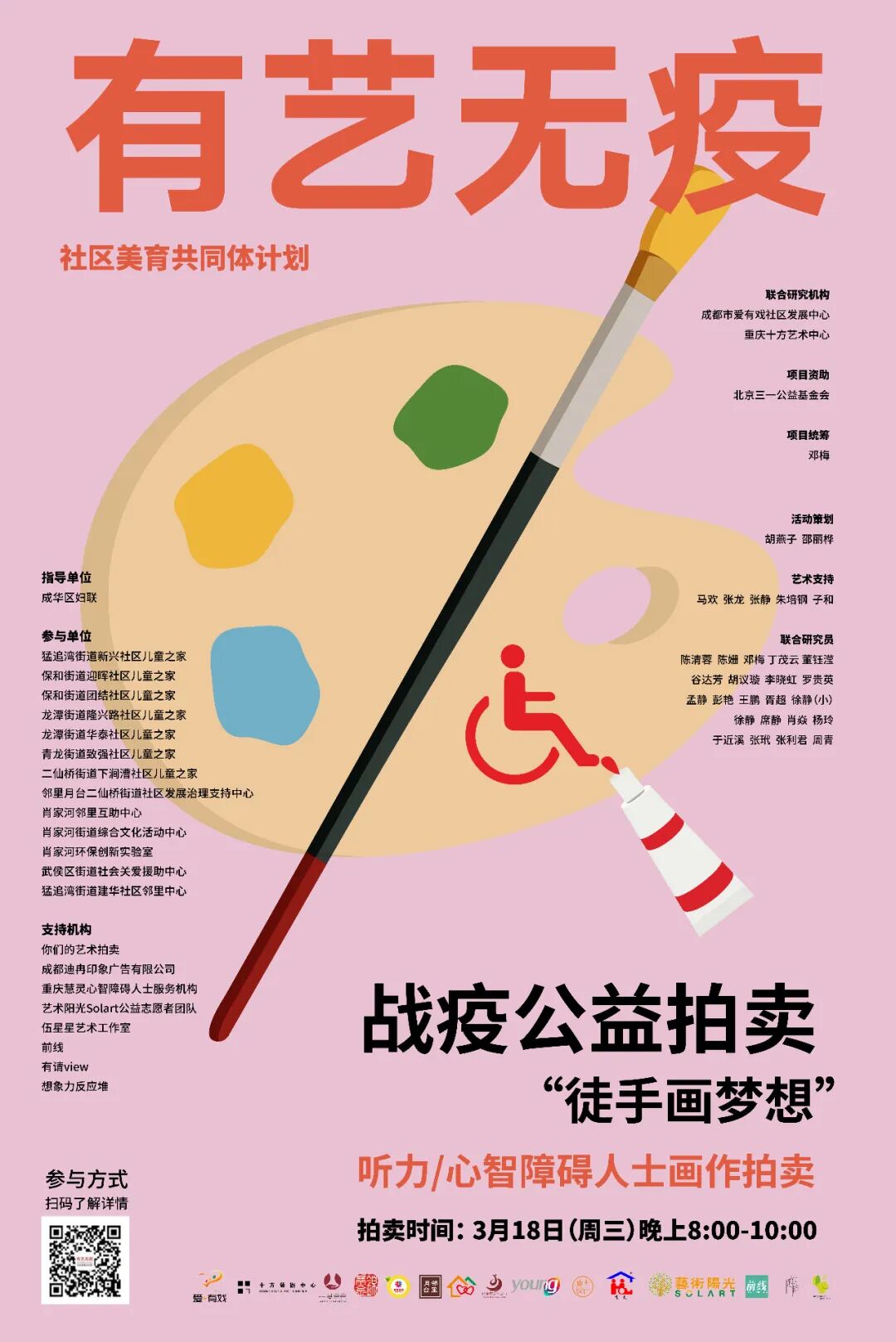 面对新冠疫情,2020年2月,爱有戏社区发展中心和十方艺术中心在三一基金会的支持下联合发起了本次“有艺无疫”社区美育共同体计划,3月份,“有艺无疫”与“你们的艺术”拍卖平台一起呈现本次的四场主题拍卖,期待汇聚众人之力创造奇迹!3月18日至3月21日,持续四场线上拍卖会为您带来不同的主题和内容:第一场:3月18日(周三)晚上8:00-10:00第二场:3月19日(周四)晚上8:00-10:00第三场:3月20日(周五)晚上8:00-10:00第四场:3月21日(周六)晚上8:00-10:00