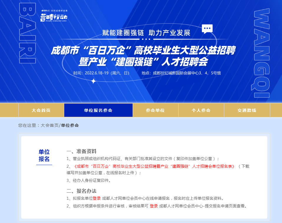2、《成都市“百日万企”高校毕业生大型公益招聘暨产业“建圈强链”人才招聘会单位报名表》 (登陆成都人才网相关专题页面下载);