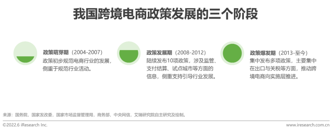 跨境电商政策和规范的建立,以及开放程度的规定是跨境电商发展的重要基础。我国跨境电商政策发展经历了三大阶段:政策萌芽期、政策发展期和政策爆发期。2020年受疫情影响后,跨境电商成为推动外贸转型升级、打造新经济增长点的重要突破口,获得了众多政策的支出。2021年,跨境电商在“十四五”时期开启了重要的战略发展机遇。
