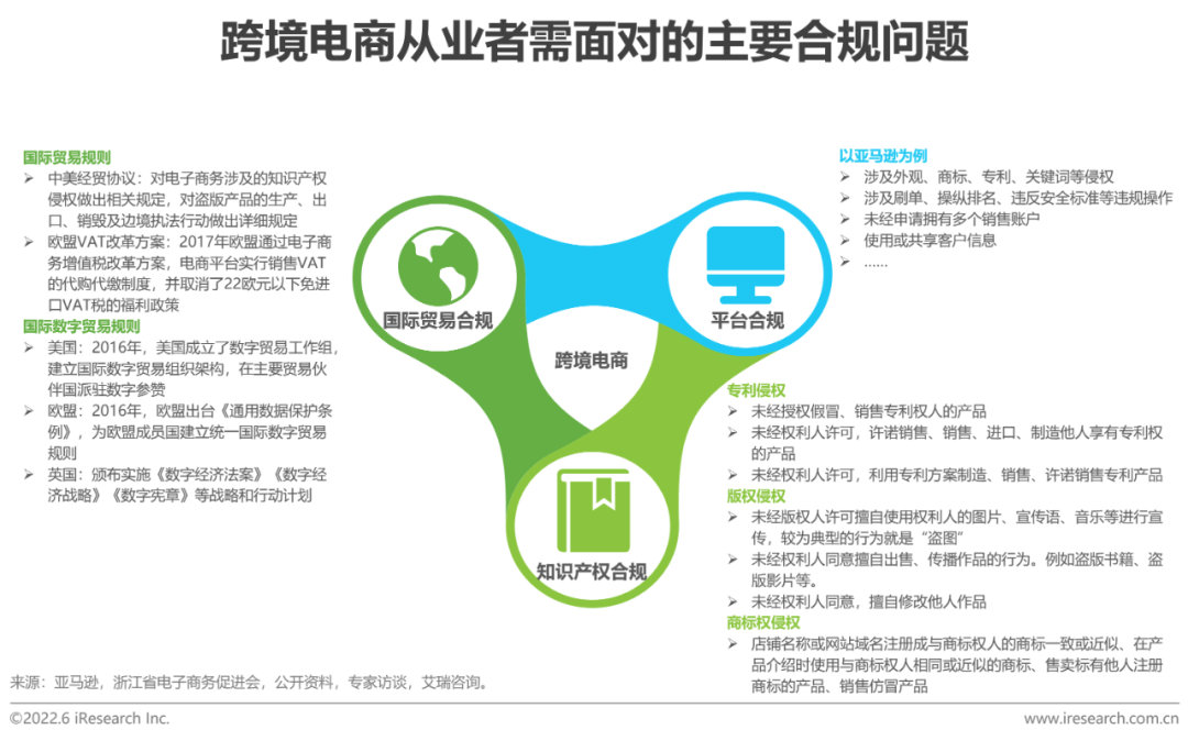 受疫情影响,在全球经贸摩擦加剧的大环境下,跨境电商行业正在经历来自国际贸易层面、知识产权层面和平台层面的合规化约束,一批批为提高营收利润选择铤而走险打“擦边球”的跨境电商企业在合规化的浪潮中被快速淘汰,其中不乏许多业内耳熟能详的头部企业。对于跨境电商行业而言,合规化宣告着市场由野蛮生长的时代逐渐过渡到理性繁荣的时代。快速精准了解各类合规政策,在合规前提下重铸良性商业闭环,成为了当下跨境电商行业参与者必须面对的重要问题。