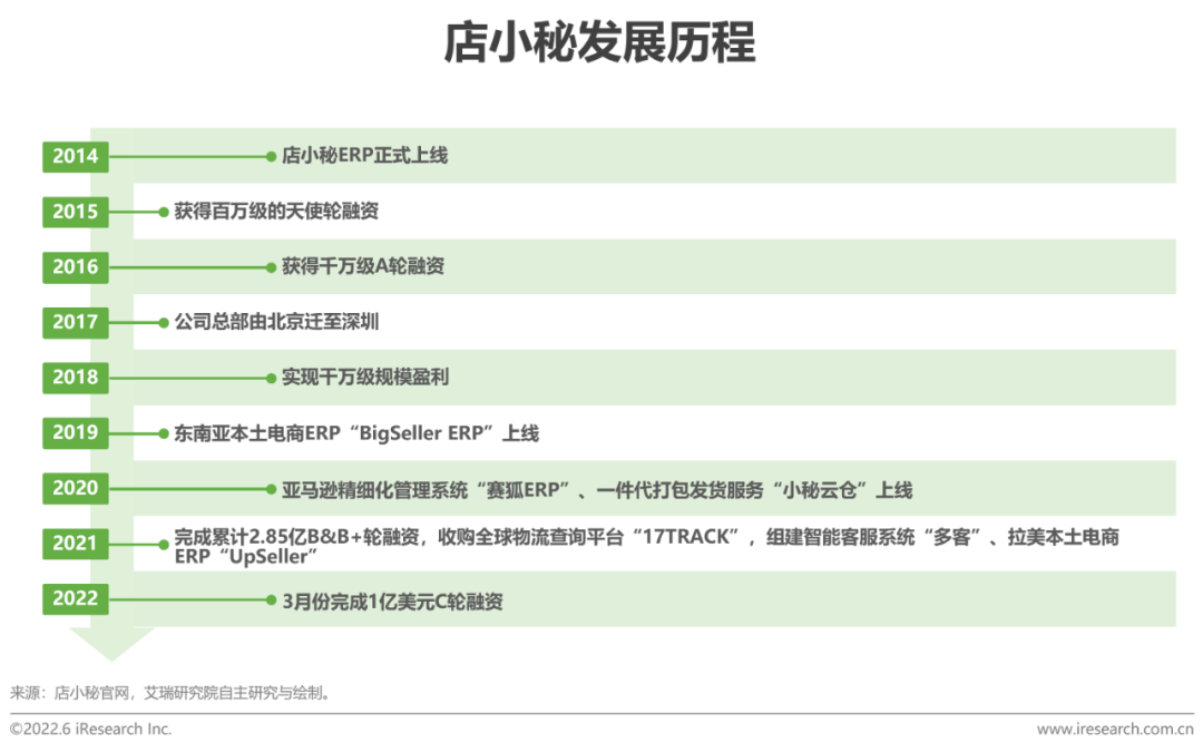店小秘成立于2014年,立足于ERP系统,持续扩充自身服务体系,通过自研、收购等形式持续完善产品矩阵,以闭环的跨境服务生态链,为全球电商卖家提供综合全面的服务体系。