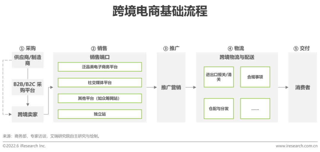 跨境电商基础流程可分为采购、销售、推广、物流和交付等环节。商务部将中国电子商务服务业分为交易型服务即以促进网上交易为目的的电子商务交易平台服务、支撑型服务即围绕电子商务的物流、资金流及信息流等方面而开展的服务、衍生型服务即伴随着电子商务应用的深入发展而催生的各类专业服务,其中衍生型服务主要在1-2个环节上为企业赋能,支撑型和交易型服务则一般赋能3-5个环节。
