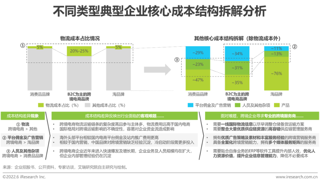 从成本结构看,跨境电商与国内的消费品和电商公司差异极大,由于跨国的缘故,跨境电商物流成本占比先天大于以国内业务为主的企业。然而即便剔除物流成本后看,平台佣金、营销、人员等方面的支出也在挤压着产品成本的占比。成本结构的差异在当下企业降本增效的大环境下揭示了跨境电商行业面临的诸多客观难题,跨境企业正在积极探索解决方案,相较于从零组建内部业务团队的中长期战略,在关键节点借助专业服务商的能力更能快速补全自身商业链条,实现降本增效。