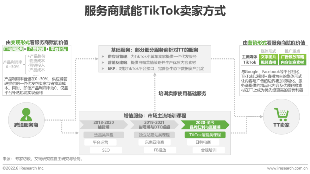 TikTok的火爆让大量跨境卖家争相成为第一批吃螃蟹的人,在红利期迅速入局,抢占先机,然而大部分卖家无法通过自身内部有限资源和精力,围绕TikTok在品牌推广、营销变现、数字资产管理、物流体系等环节形成良性商业闭环,这时大量细分服务商快速响应,充分发挥自有专业资源为TikTok卖家提供有效基础服务。目前围绕TikTok的跨境电商商业化路径暂未能给许多卖家和服务商带来相当可观的收益,但许多服务商甚至卖家开始提供培训一类的增值服务,一方面能为第二批相对谨慎的入局者减少信息不对称,另一方面也基于TikTok这一风口通过培训创造和传递价值实现盈利。