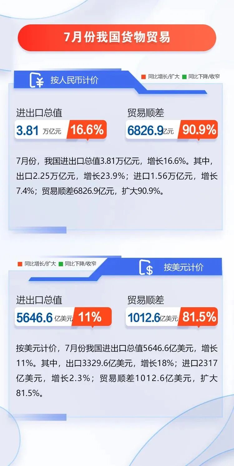具体来看,前7个月累计,我国出口13.37万亿元,增长14.7%;进口10.23万亿元,增长5.3%;贸易顺差3.14万亿元,扩大62.1%。