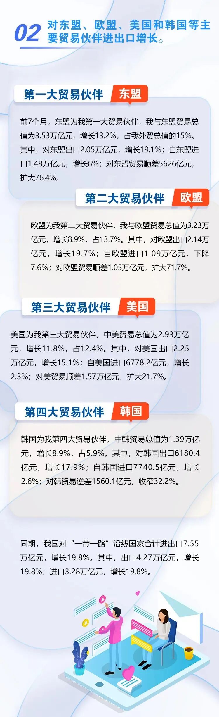 从主要贸易伙伴看,前7个月,东盟、欧盟、美国和韩国是我国前四大贸易伙伴,分别进出口3.53万亿元、3.23万亿元、2.93万亿元和1.39万亿元,分别增长13.2%、8.9%、11.8%和8.9%。