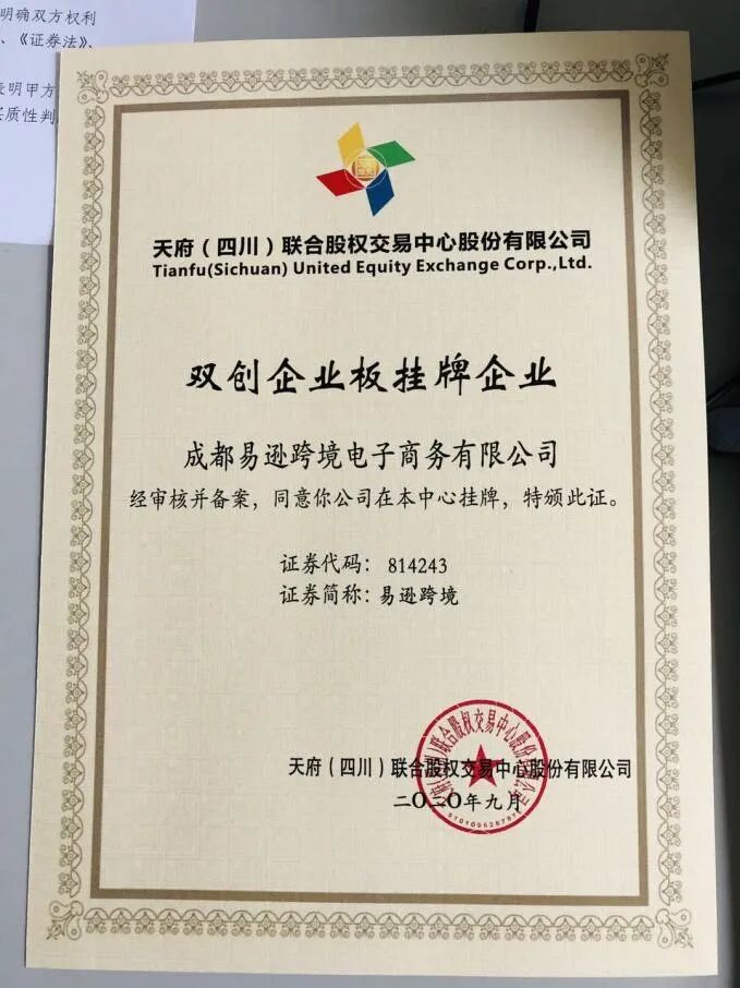 2020年9月,易逊跨境成功在天府(四川)联合股权交易中心股份有限公司完成双创企业板企业挂牌。