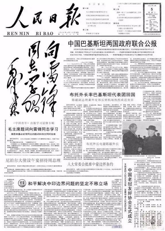 1963年3月5日,毛泽东“向雷锋同志学习”的题词在《人民日报》发表