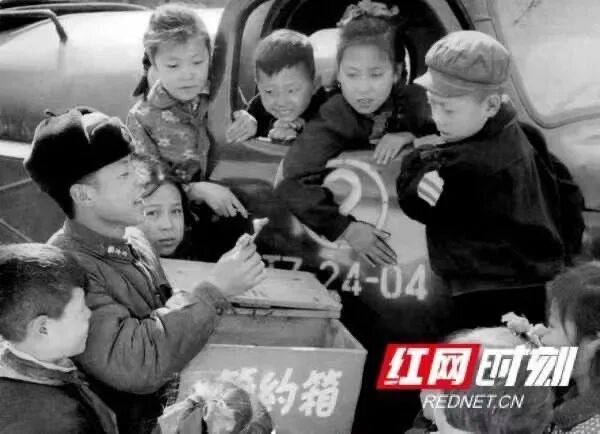 1961年,雷锋让来运输连队的建设街小学少先队员参观自己的节约箱,讲解节约箱的来历。