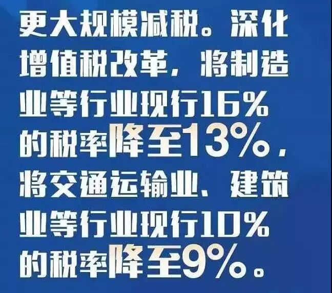 国务院总理李克强关于政府工作的报告中提到:要深化增值税改革,今年将制造业等行业现行16%的税率降至13%,将交通运输业、建筑业等行业现行10%的税率降至9%;保持6%一档的税率不变,但通过采取对生产、生活性服务业增加税收抵扣等配套措施,确保所有行业税负只减不增。