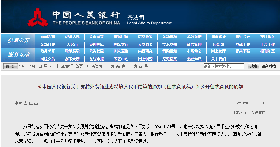 中国人民银行关于支持外贸新业态跨境人民币结算的通知(征求意见稿)