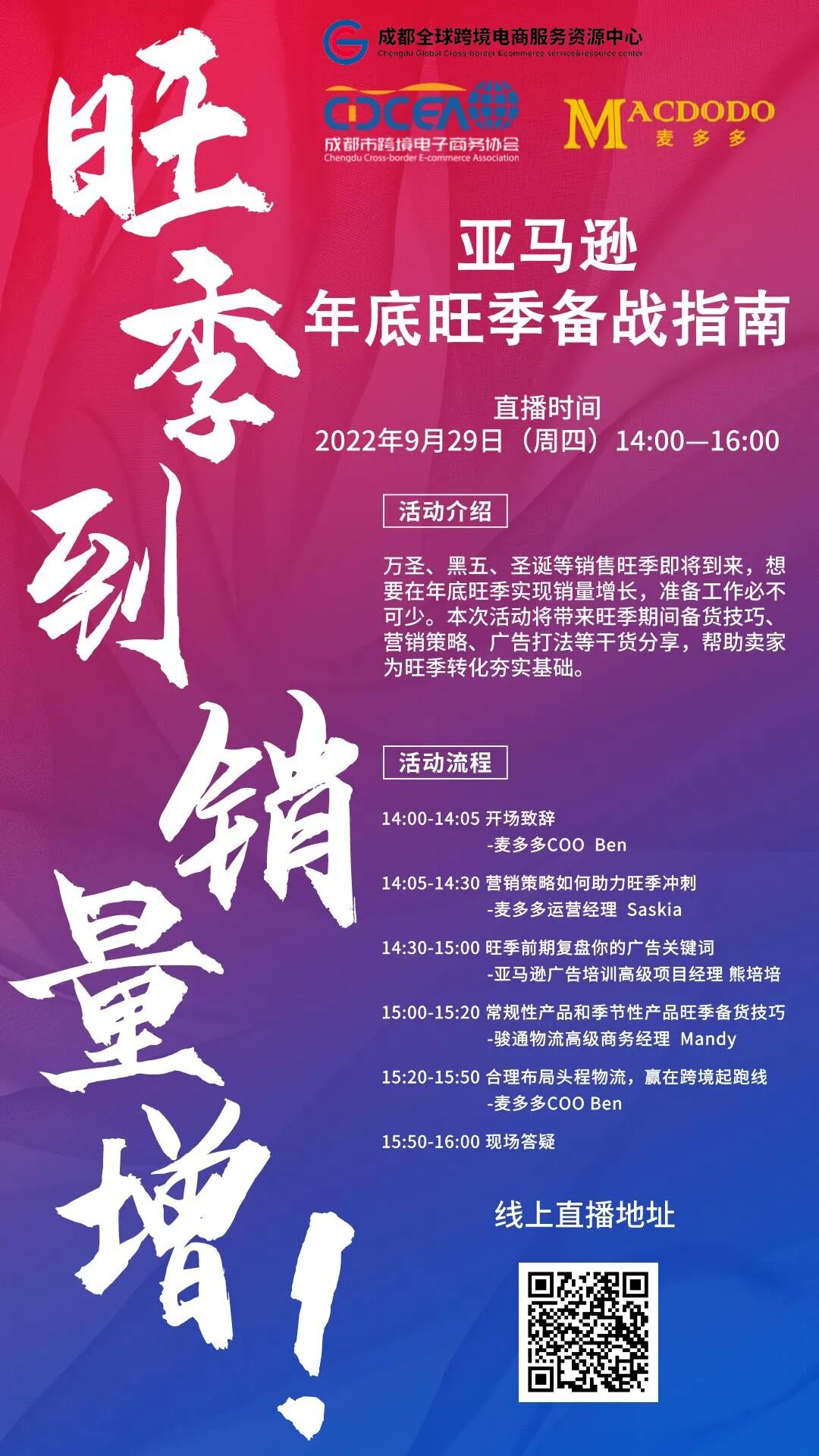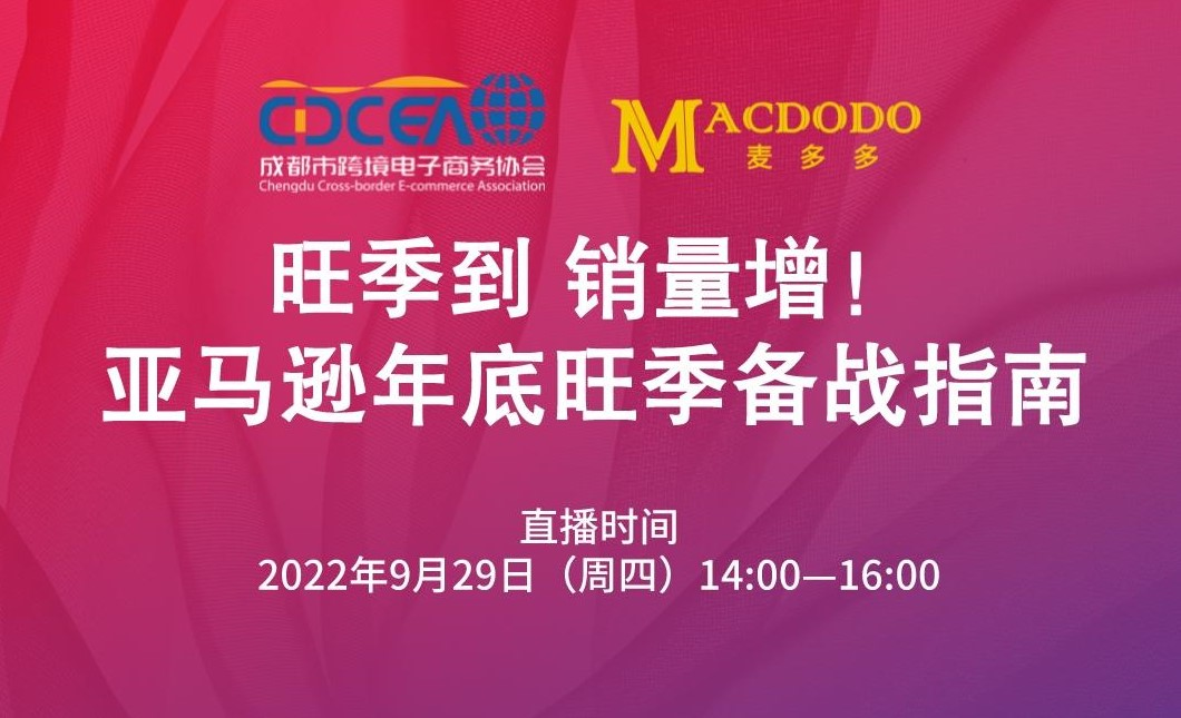 万圣、黑五、圣诞等销售旺季即将到来,卖家朋友们想要在年底旺季实现销量增长,准备工作自然必不可少。成都市跨境电子商务协会理事单位麦多多联合成都市跨境电子商务协会将于9月29日(周四)下午2点举办线上直播活动—亚马逊年底旺季备战指南,本次活动将带来旺季期间备货技巧、营销策略、广告打法等干货分享,帮助卖家为旺季转化夯实基础。