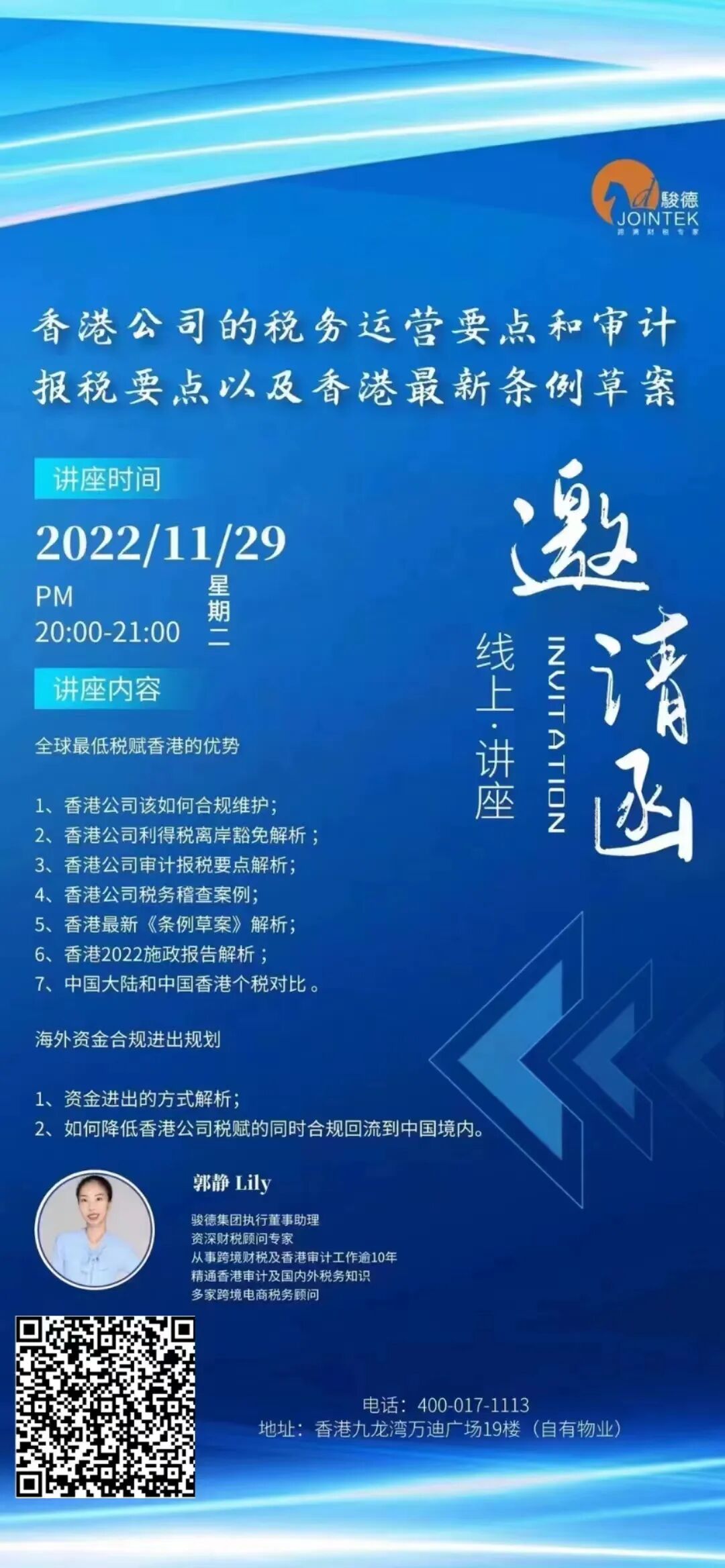 • 主讲老师:骏德集团执行董事助理/资深税务顾问 郭静Lily