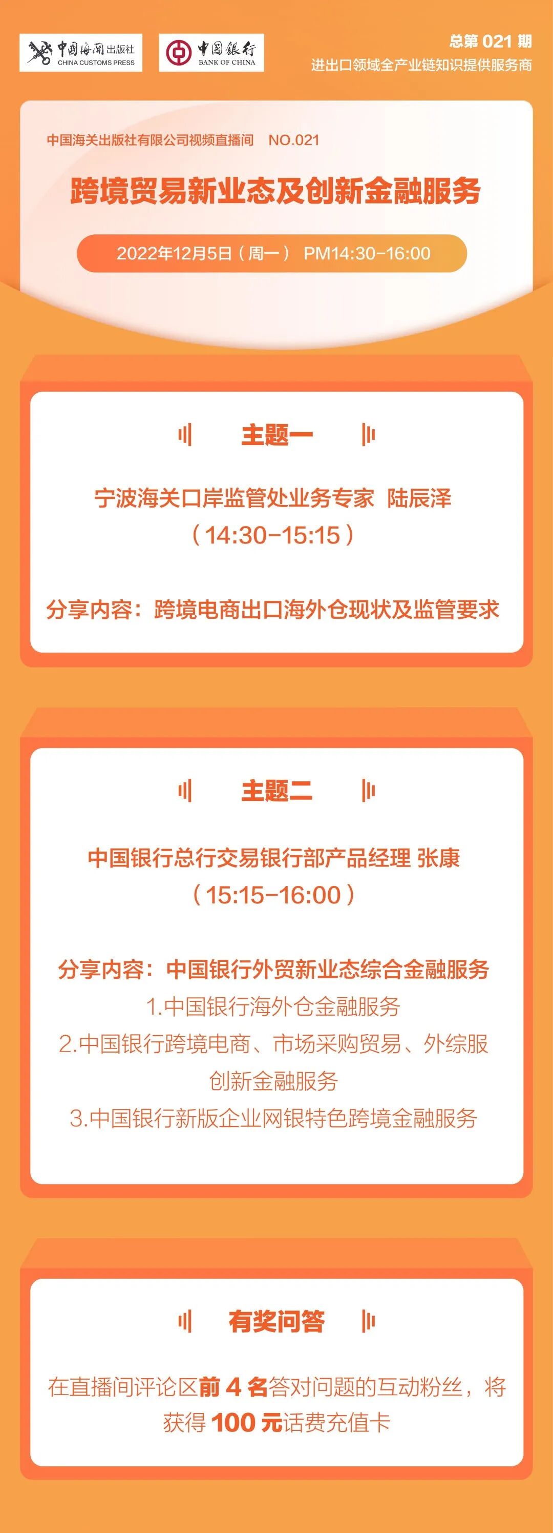 为促进跨境贸易新业态发展,加快金融等贸易服务领域不断创新,中国海关出版社有限公司定于2022年12月5日(周一14:30-16:00线上召开“跨境贸易新业态及创新金融服务”为主题的视频直播活动。本期直播间,海关相关业务专家将为大家解读“跨境电商出口海外仓现状及监管要求”。