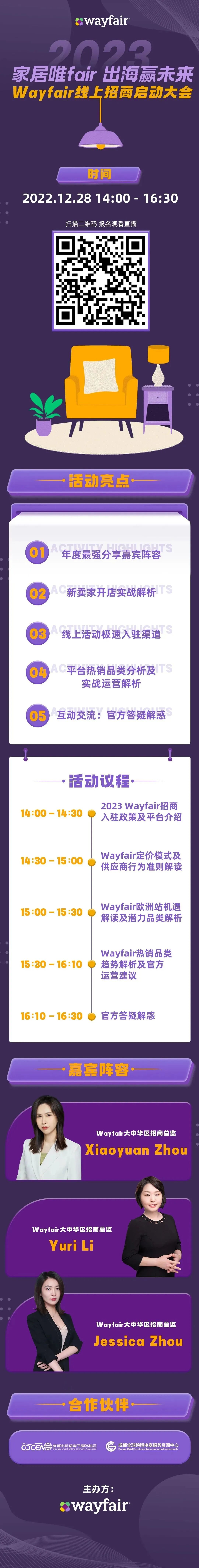 美国最大家居电商平台Wayfair官方来啦!12月28日14:00-16:30,Wayfair官方将举办“2023家居唯fair 出海赢未来-Wayfair线上招商启动大会”,帮助卖家朋友们了解Wayfair规则、入驻及平台运营等讯息,现场解析平台热销品类及实战运营技巧,更有官方人员现场答疑解惑噢~