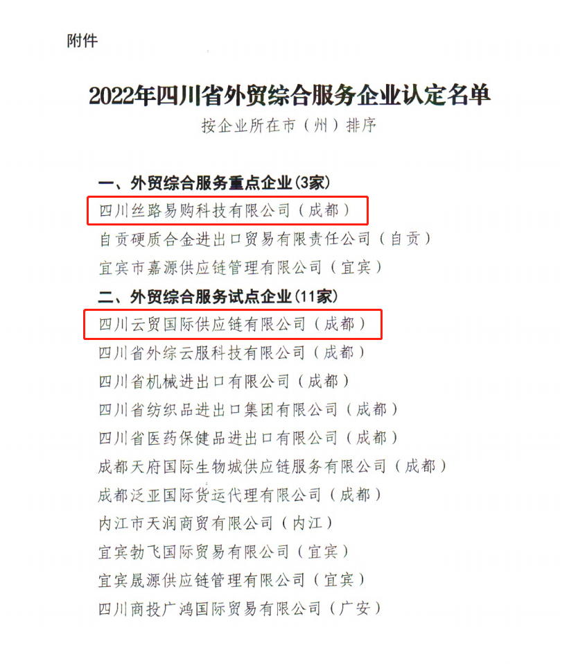 近日,四川省商务厅、成都海关、国家税务总局四川省税务局、国家外汇管理局四川省分局联合发文《关于开展2022年四川省外贸综合服务企业认定工作的通知》(川商贸创〔2022〕10号),经企业申报、评审单位初审和复审等程序后,全省14家企业入选2022年四川省外贸综合服务企业。四川港投集团陆海云港公司所属四川云贸国际供应链公司获认定为“外贸综合服务试点企业”;四川丝路易购科技公司获认定为“外贸综合服务重点企业”,是全省三家重点企业中成都市唯一入选企业。