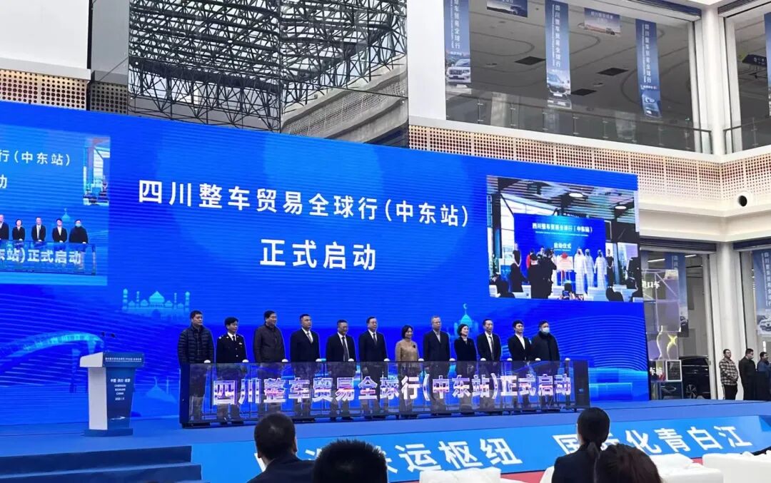 1月5日,四川整车贸易全球行启动仪式(中东站)在阿联酋迪拜阿维尔汽车交易中心、成都市青白江区中欧汽车城两个会场线上线下同时举行。商务部驻成都特派办副特派员邓德雄、中国驻迪拜领事馆参赞吴毅、四川省商务厅副厅长乔方、成都市商务局总经济师周立志、成都市青白江区区长王林等分别在四川和迪拜会场参加活动。