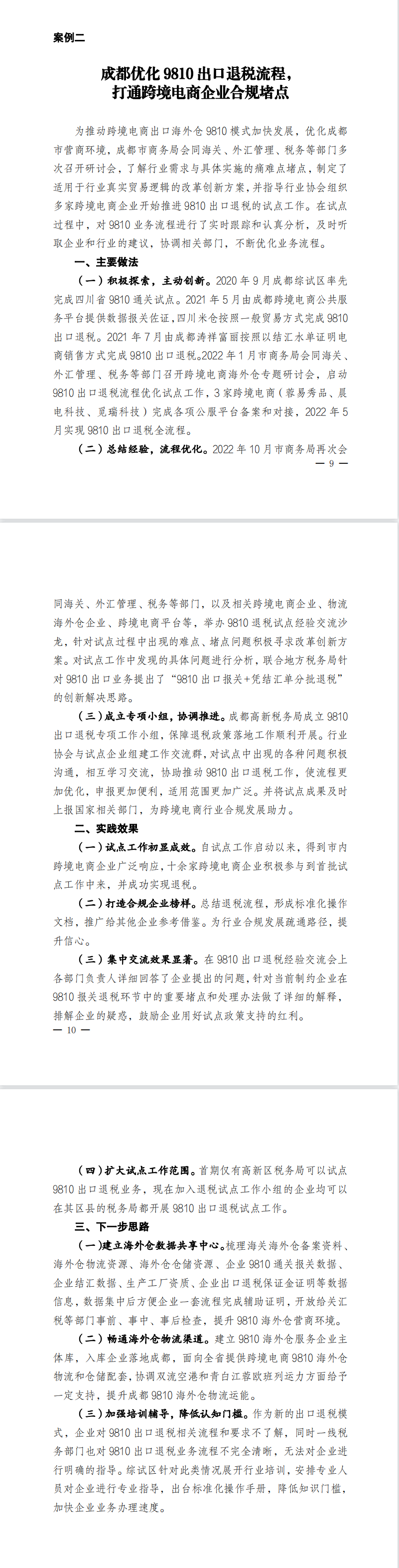 为推动跨境电商出口海外仓 9810 模式加快发展,优化成都市营商环境,成都市商务局会同海关、外汇管理、税务等部门多次召开研讨会,了解行业需求与具体实施的痛难点堵点,制定了适用于行业真实贸易逻辑的改革创新方案,并指导行业协会组织多家跨境电商企业开始推进 9810 出口退税的试点工作。在试点过程中,对 9810 业务流程进行了实时跟踪和认真分析,及时听取企业和行业的建议,协调相关部门,不断优化业务流程。