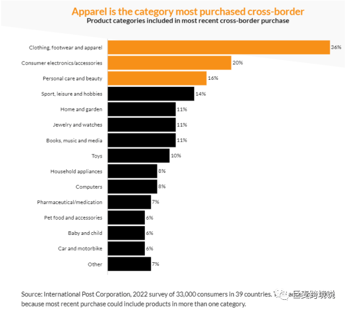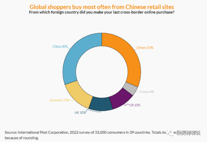 2022年,国际邮政公司(International Post Corporation)发起了一份跨境电商消费调研,调研对象涉及39个国家中的3.3万名消费者,同时这批消费者在过去三个月内至少进行了一次跨境电商购物。