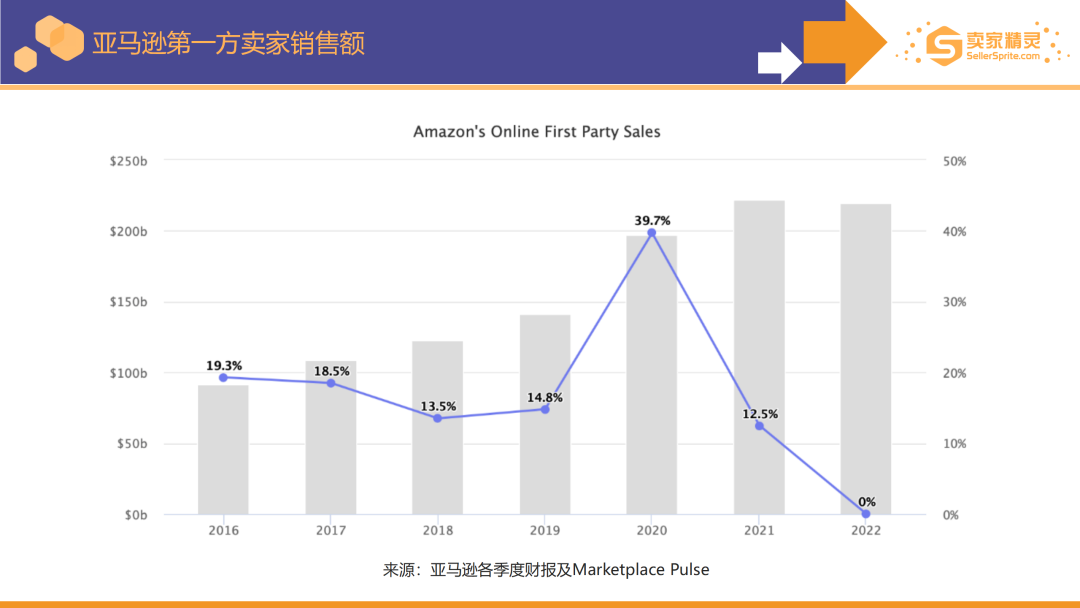 其中2022年亚马逊第一方卖家(即供应商卖家)销售额为2200亿美元,比2021年下降 0.9%。下降的部分原因是同比汇率变化的不利影响。但即使考虑到外汇影响,2022年的增长也与往年形成鲜明对比。