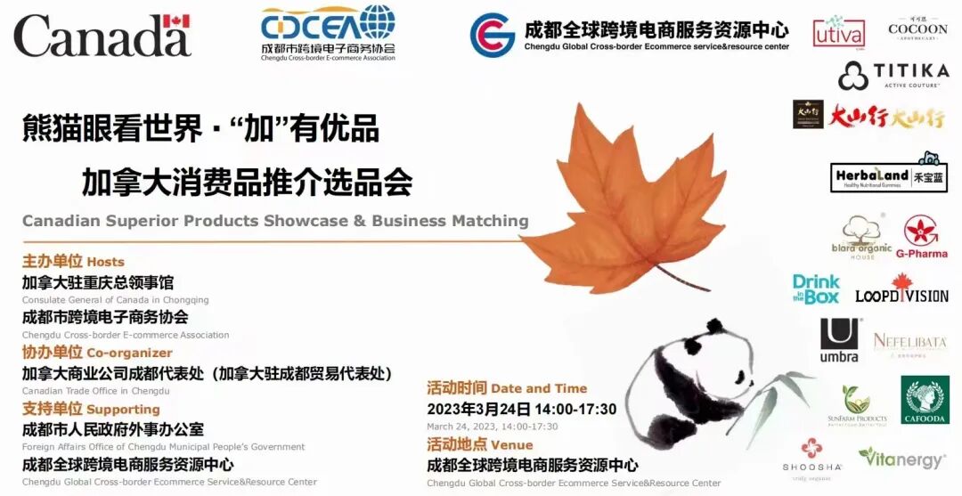 3月24日,由加拿大驻重庆总领事馆和成都市跨境电子商务协会联合主办,加拿大商务公司成都代表处(加拿大驻成都贸易代表处)协办,成都市人民政府外事办公室、成都全球跨境电商服务资源中心支持的2023“熊猫眼看世界·加有优品”——加拿大消费品推介选品会在成都全球跨境电商服务资源中心成功举行。