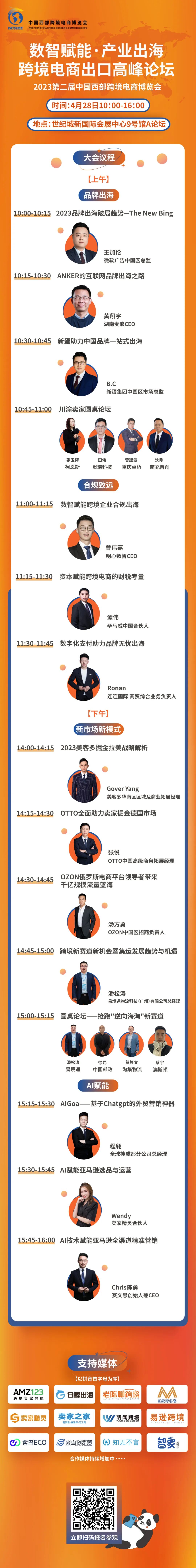 本次博览会聚集了来自全国以及国际的跨境电商生态企业,其中不乏上市公司与优质产业带企业:三诺生物、彩虹电器、科瑞普医疗器械;跨境进口龙头企业:优时通、伊藤电商、云贸国际、乾盛供应链;知名电商平台:阿里巴巴国际站、中国制造网、新蛋、速卖通、美客多、OTTO、OZON悉数亮相;金融科技与财税合规企业:蚂蚁金服万里汇、连连国际、明心数智、交子商管、建设银行、兴业银行星光熠熠;国际物流企业:四川邮政、极兔国际、云途物流、急速物流、丝路里供应链、天恩木供应链、纬狮物流、上海瑞链物流、亦邦物流、柏域斯浩航覆盖全球主流市场、提供专业国际物流解决方案;更有西窗科技(微软必应)、全球搜(Google)、卖家精灵硬核科技压轴呈现。