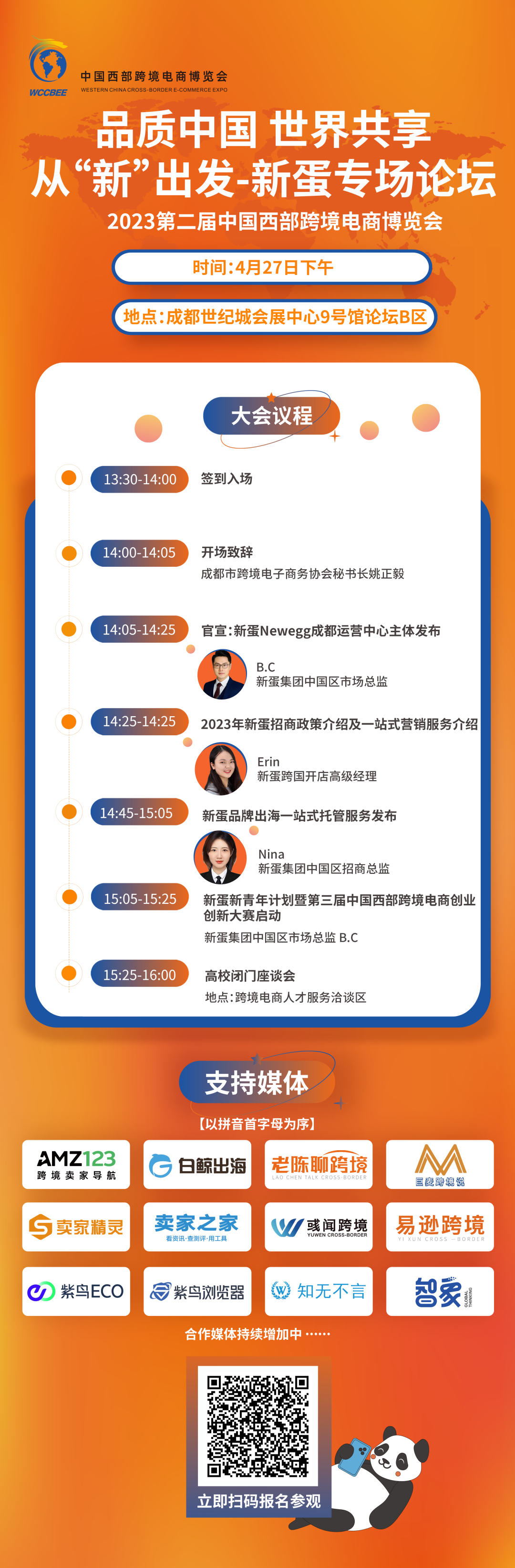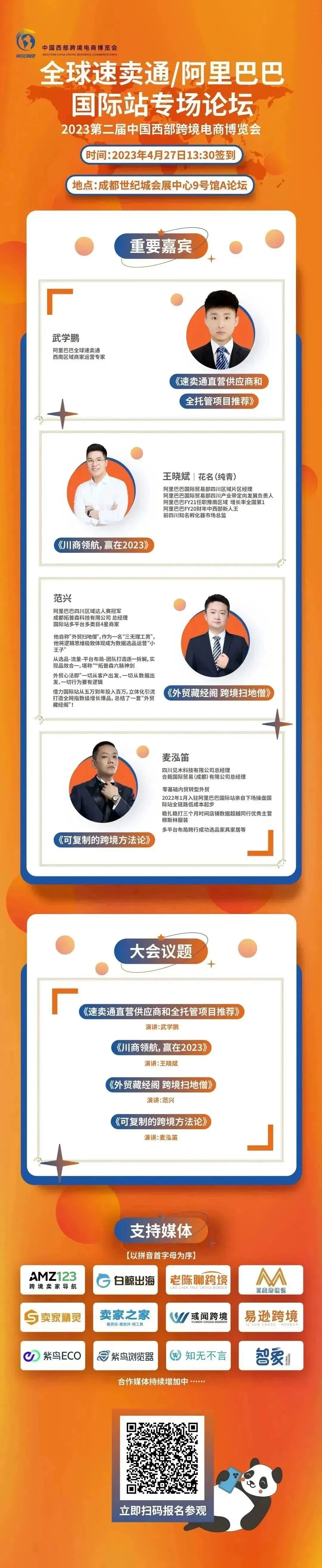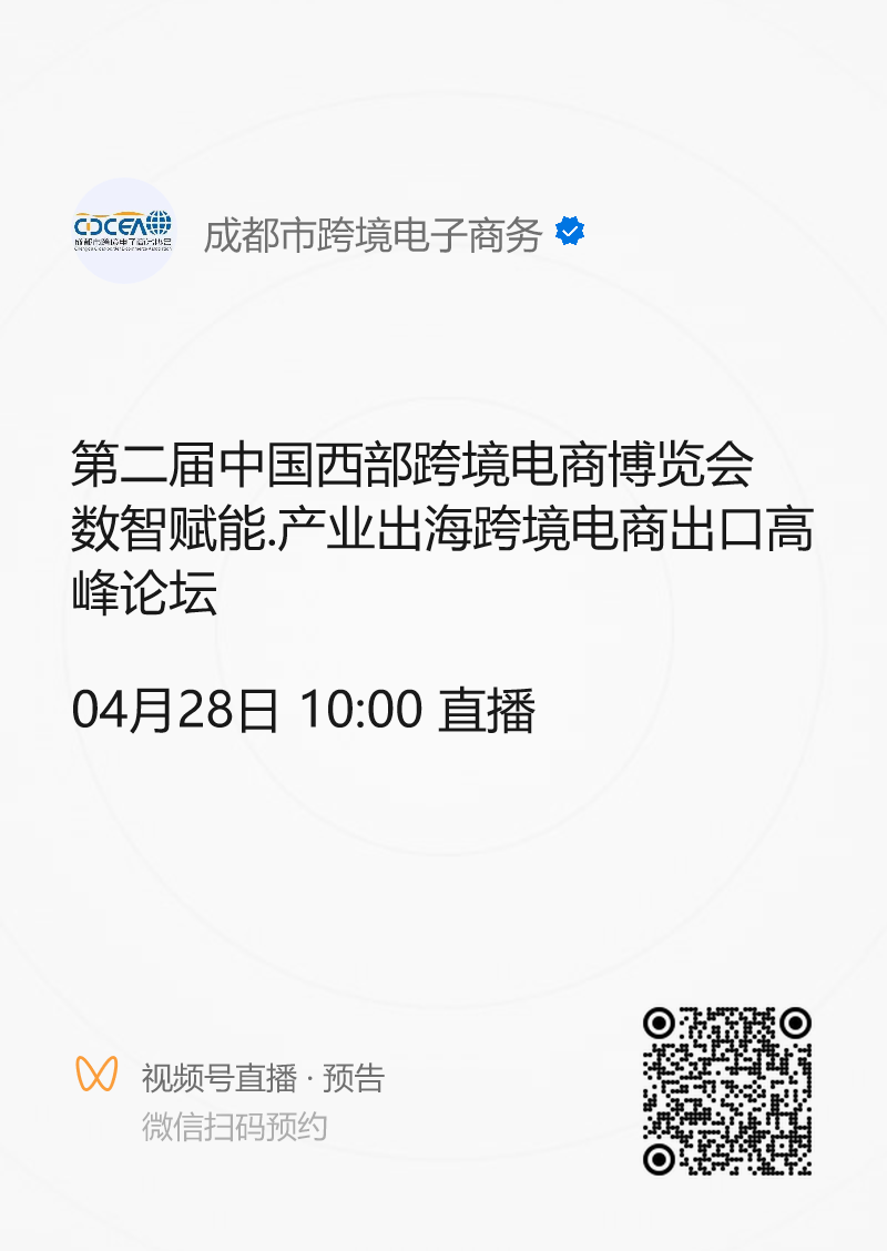 由商务部外贸发展事务局、四川省商务厅指导,成都市商务局和四川省人民政府驻重庆办事处支持,成都市跨境电子商务协会和四川省供货商商会联合主办的“第二届中国西部跨境电商博览会” 将于4月27日-29日在成都世纪城国际会展中心举行。大会以“群英汇天府,数贸通全球”为主题,规模近20000平方米,汇聚跨境电商展商近400家,预计将吸引超过50000人次观众到场。
