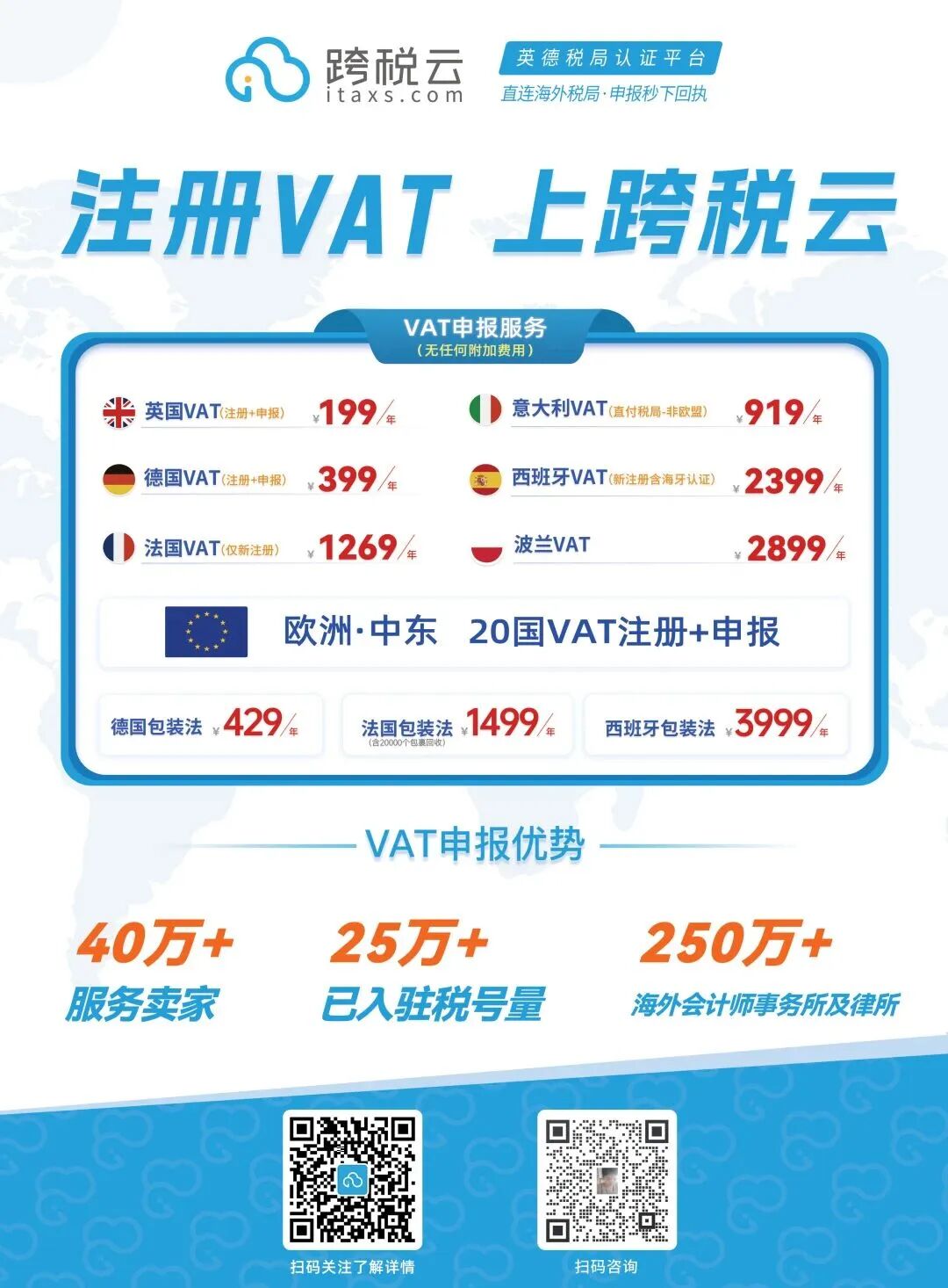 目前,跨税云所属集团分别在深圳、广州、杭州、太原、郑州、武汉、长沙等国内主要城市及英德法美等全球多国设立办事处,与全球250+海外会计师事务所及律师达成合作,申报税号250000+,累计为全球400000+跨境电商卖家提供专业高效的出海合规服务。