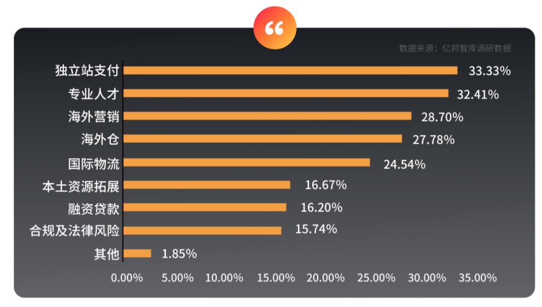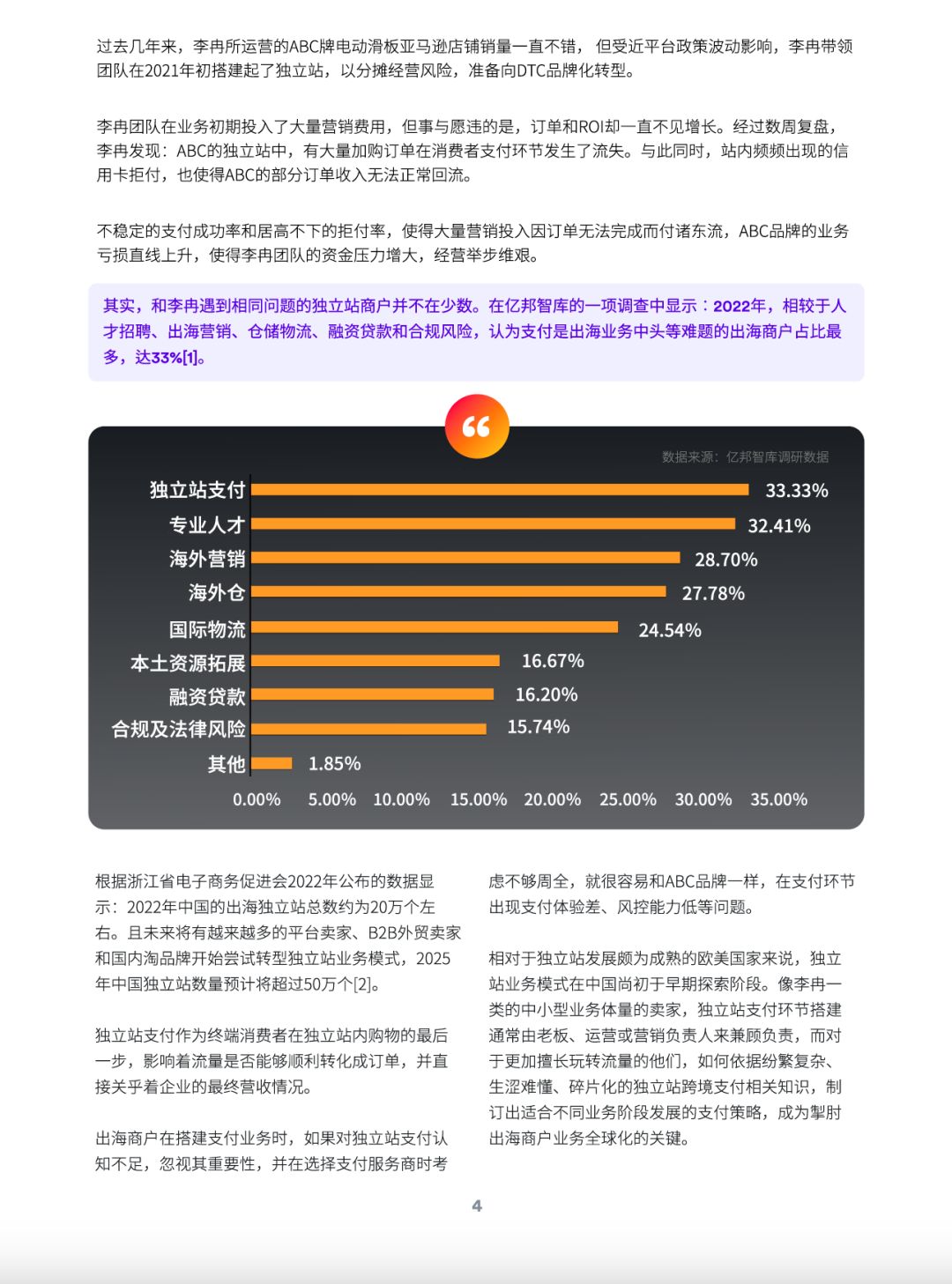 和平台相比,独立站并不自带流量,需要商户通过SEO优化、社媒推广、广告投放等各种方式来吸引站外流量。但在亿邦智库的一项调查中显示:2022年,相较于海外营销、人才招聘、仓储物流、融资贷款和合规风险,认为独立站支付是出海业务中头等难题的出海商户占比最多,达33%[2]。