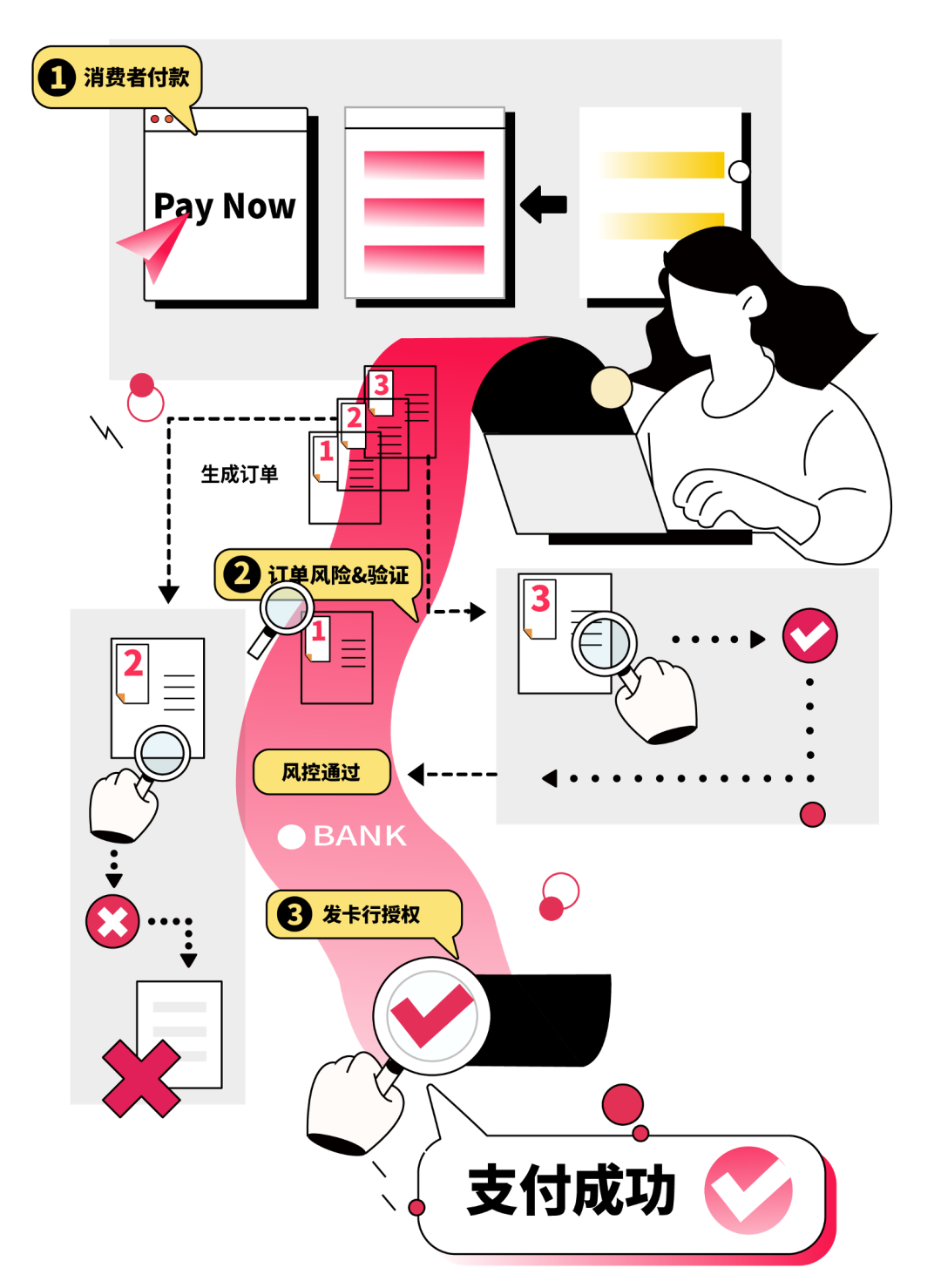 一笔独立站订单付款可以拆分成:消费者支付-订单风控-订单验证-订单授权及收单请款等多个环节(如下图)。在业务实践中,支付流程中的每个环节,都有诸多因素直接或间接地导致支付订单最终无法成功付款。