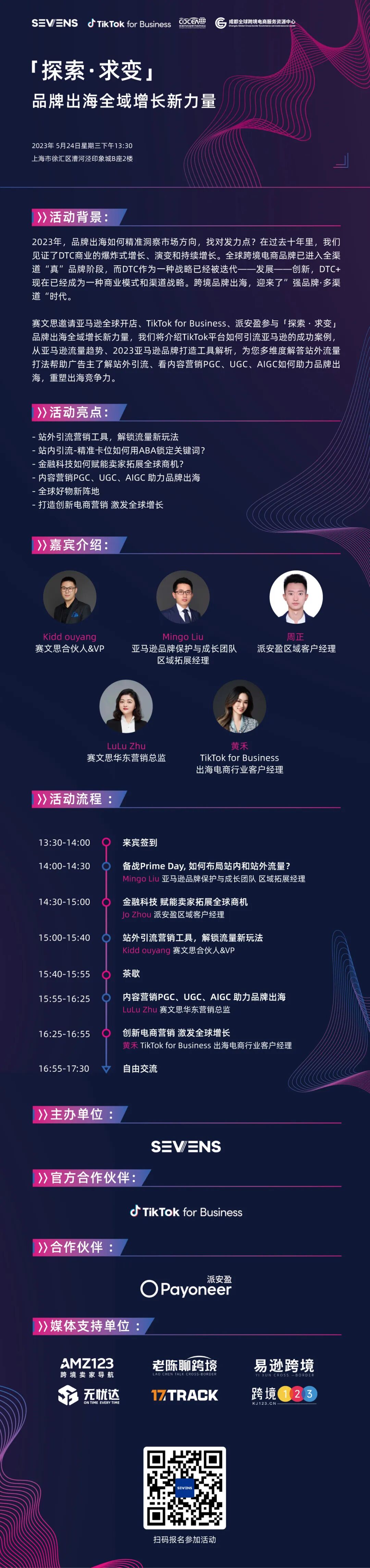 赛文思携手亚马逊全球开店、TikTok for Business、派安盈将在5月24日上海站进行「探索 · 求变」品牌出海全域增长新力量城市活动,我们将从站内外引流营销工具出发,以内容营销、创新电商趋势及金融科技为方向,助力品牌出海,现场还将有针对今年primeday的隐藏打法和独家福利现场揭晓!名额有限,先到先得,赛文思欢迎大家来玩~