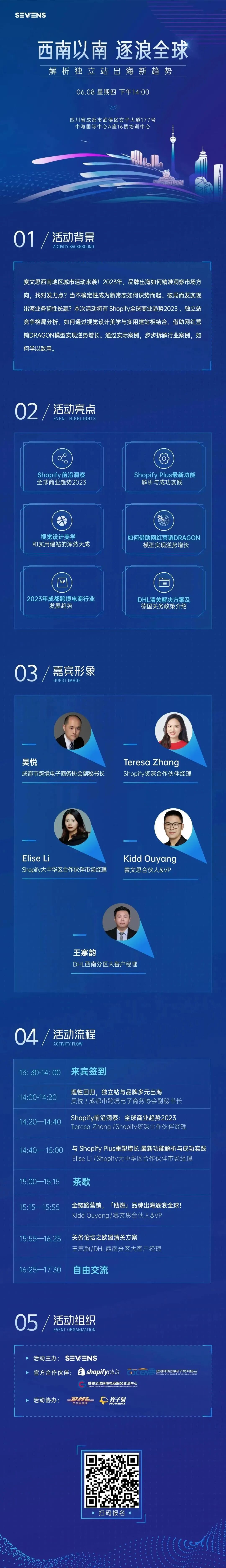 成都市跨境电子商务协会携手赛文思、Shopify官方共同打造成都城市活动,6月8日 「西南以南,逐浪全球」解析独立站出海新趋势,带你一起精准洞察市场方向,洞悉独立站竞争格局~我们成都见!