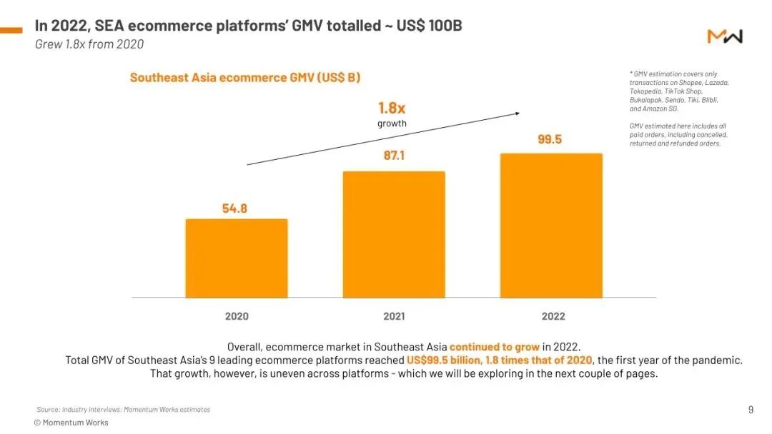 近日,Momentum Works发布了一份东南亚电商的报告,数据显示,2022年,Shopee、Lazada、Tokopedia等九大电商平台的GMV同比增长14%,达到995亿美元,是2020年的1.8倍。