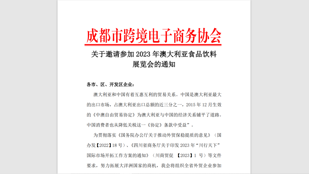 为贯彻落实《国务院办公厅关于推动外贸保稳提质的意见》(国办发【2022】18号)、《四川省商务厅关于印发2023年“川行天下”国际市场开拓工作方案的通知》(川商贸促 【2023】1号)等文件要求,努力拓展大洋洲国家的商机,我会将组织全省外贸企业参加2023年9月在澳大利亚悉尼举办的澳大利亚食品饮料展览会。为切实做好此次组织参展工作,现将有关事项通知如下:
