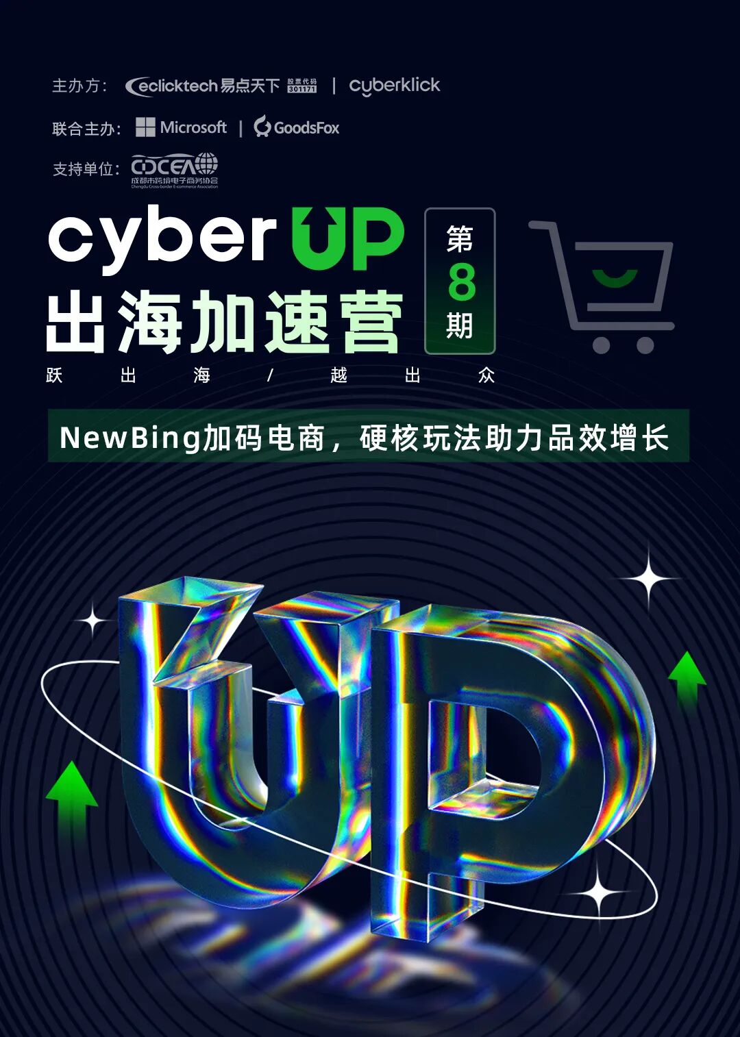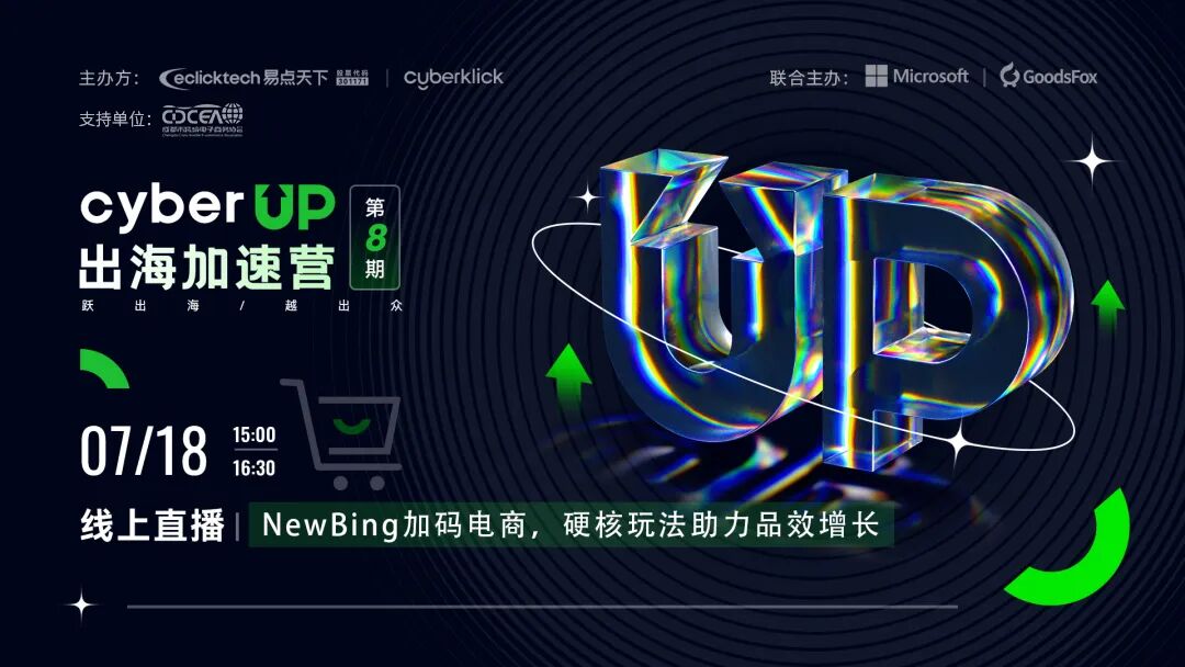 7月18日,易点天下Cyberklick联合Microsoft广告、GoodsFox共同主办CyberUp系列活动第八期【NewBing加码电商,硬核玩法助力品效增长】线上直播。四位行业资深专家将结合New Bing为您带来最新的行业动态、市场数据分析、电商选品洞察及营销投放技巧。