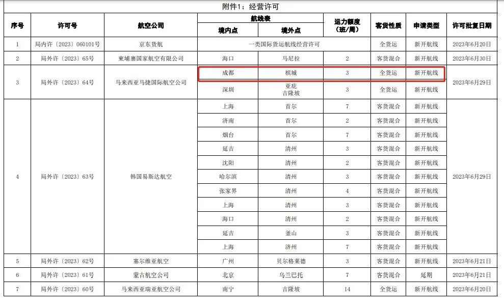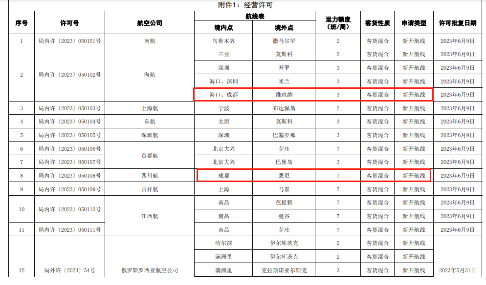 据了解,这3条航线分别为:成都至悉尼的客货混合航线,计划每周7班,由四川航空执飞;成都至维也纳的客货混合航线,计划每周3班,由海南航空执飞;成都至槟城的全货运航线,计划每周3班,由马来西亚马捷国际航空公司执飞。
