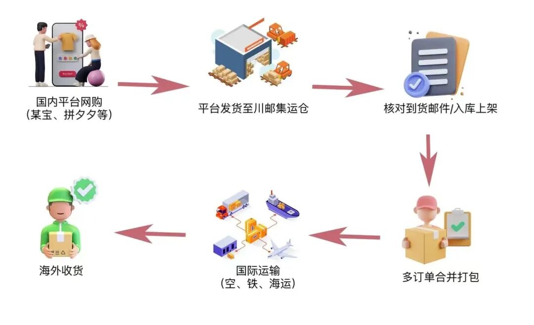 是把从不同国内商家、不同时间购买的商品,或者需邮寄的物品,先后寄到川邮集运仓暂存,集齐打包后,寄送到海外目的地的服务。