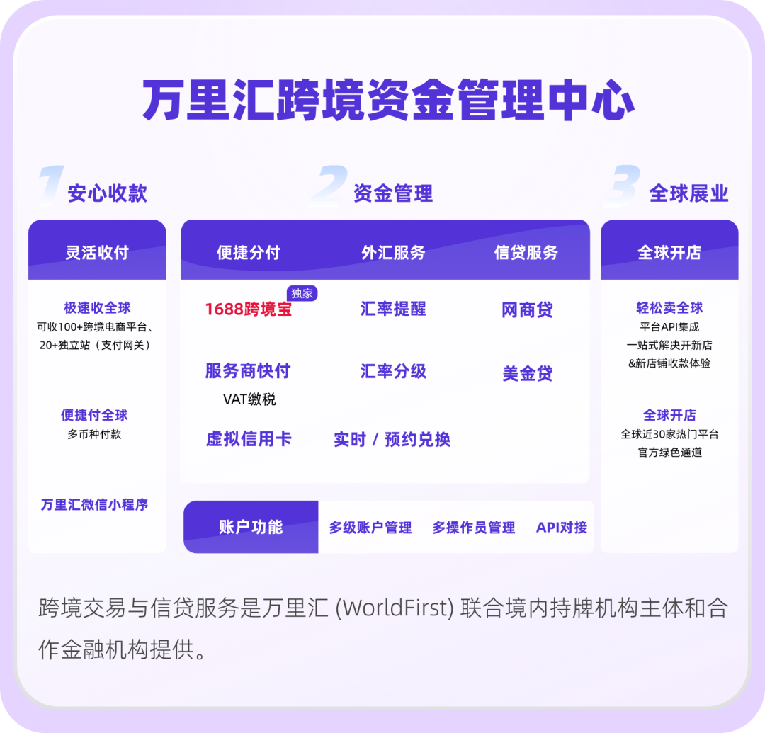 万里汇(WorldFirst)是蚂蚁集团旗下品牌,现已发展为服务全球跨境中小企业的一站式数字支付和金融服务平台。在《跨境支付机构 TOP20 强》排行榜上,万里汇(WorldFirst)连年排第一。